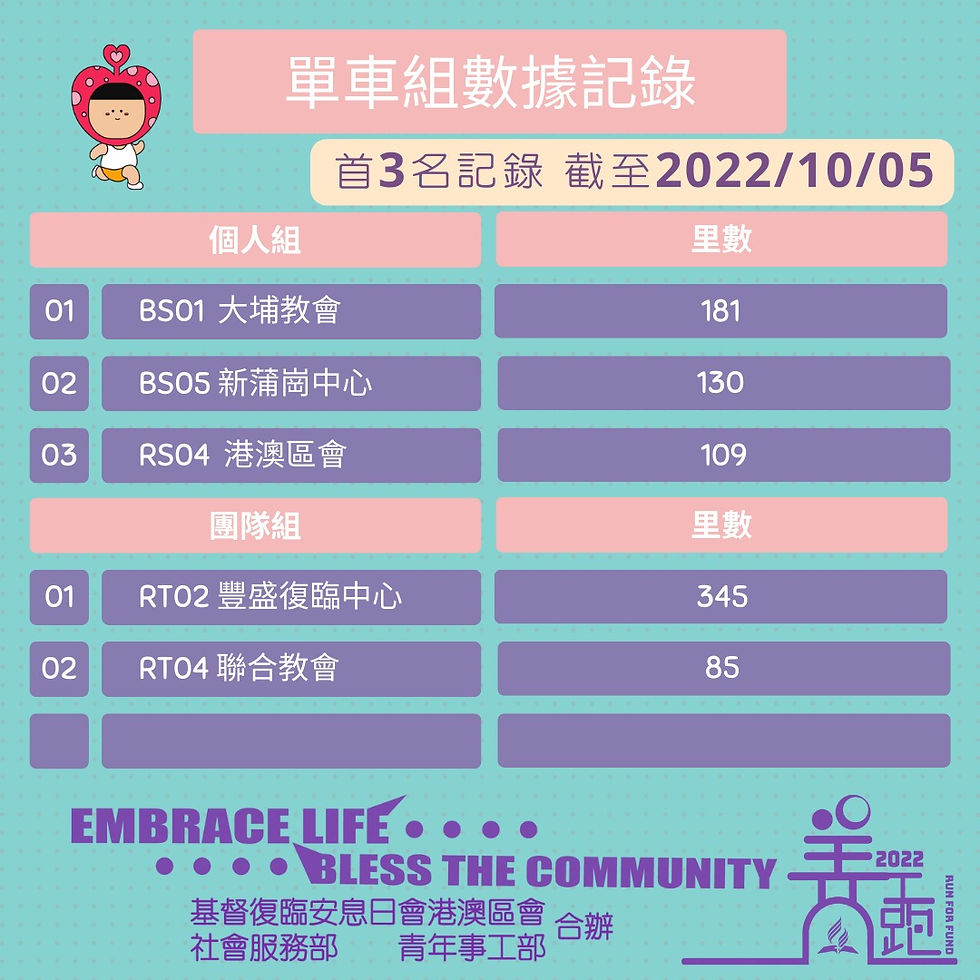 活動已經截止報名,亦表示活動時間也過了一半, 所以大家已報名的, 可以開始上報資料及捐款。 這些是暫時在各組的首三位資料, 大家繼續加油努力呀。