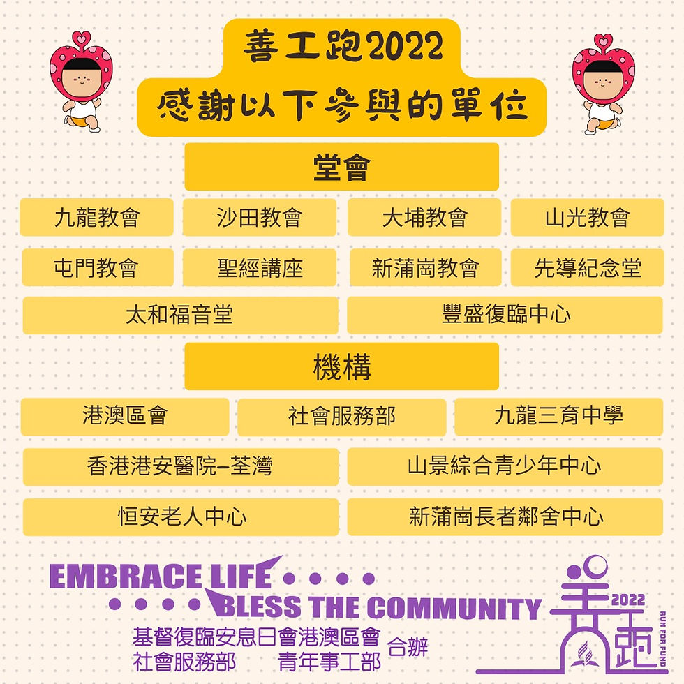 統計今年參加的堂會及機構共17個單位, 十分感謝以下的單位參與。 堂會分別有九龍教會、沙田教會、大埔教會、山光教會、屯門教會、聖經講座、新蒲崗教會、先導紀念堂、太和福音堂、豐盛復臨中心,共十所堂會。 而機構包括有港澳區會、社會服務部 、恒安老人中心、九龍三育中學、香港港安醫院—荃灣、新蒲崗長者鄰舍中心、山景綜合青少年服務中心,共七個單位。